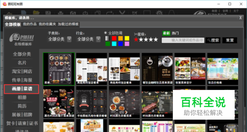 在“图旺旺在线模板库”分类中,选择“画册|菜谱”选项,子类别中选择“菜谱”选项。