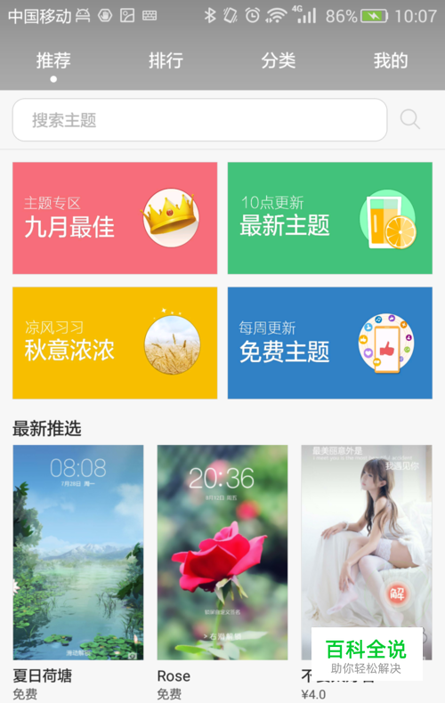 主题app的首页就是主题推荐。我们可以通过主题专区、最新主题、秋意浓浓、免费主题进入我们需要的主题界面,也可以下来看有哪些最新推选。