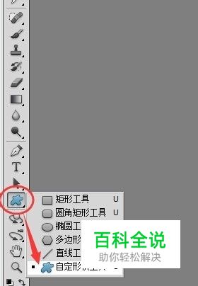 进入工作界面后,点击鼠标按住左侧工具栏上的图形工具,在弹出的子菜单上选择【自定形状工具】。