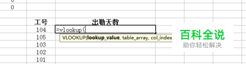 输入的公式内容为=vlookup(F11,考勤记录!A:C,3,False),F11是要查找的对象,现在是“104”;考勤记录!A:C 是查找的区域范围(考勤记录是当前工作表名,A:C是指A到C列),也是图中的红色区域;3是查找范围内的第3列,也就是C列——考勤天数一列;false是精确度类别,表示精确查找。 这句话的意思是,在”考勤记录!A:C“中查找工号为104的那一行,第3列的记录,结果应该是”29“。