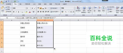 下图表格,要为B列内容的乐字添加括号,因为乐字的位置都是在文本的最后,考虑用函数公式添加括号,输入公式=LEFT(B1,LEN(B1)-1)&"("&RIGHT(B1)&")",下拉复制。