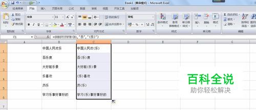 如果要添加符号的字符位置不统一,可以用另一个公式=SUBSTITUTE(B1,"乐","(乐)"),下拉复制公式。