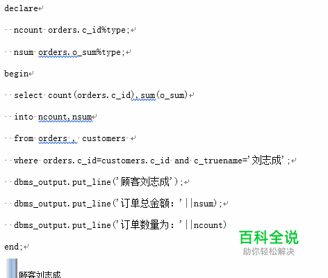 该用户有多条订单信息,多个返回结果无法写入一个变量,捕获异常。 declare v_oid orders.o_id%type; begin select o_id into v_oid from orders, customers where orders.c_id=customers.c_id and c_truename='刘志成'; dbms_output.put_line(v_oid); exception when too_many_rows then dbms_output.put_line('捕获到预定义异常,返回记录多于一条。'); when NO_DATA_FOUND then dbms_output.put_line('捕获到预定义异常,该用户没有订单。'); end;