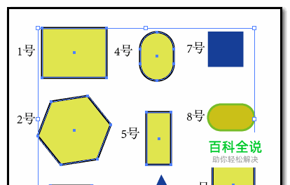 1号,2号,3号,4号,5号,9号,这6个图形都是描了黑边;假设现在要把这6个图形同时替换成填充色为黄色,黑色描边不变。 那么,我们可以这样操作, 先在这6个图形任意一个图形中点击,选中它。比如,点下1号图形,选中1号图形。