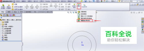 点击特征下的曲线 — 螺旋线/涡状线,点击外圆进入螺旋线特征,输入螺距150,圈数1,点击确定。 同样操作对内圆进行绘制螺线。