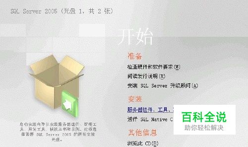 SQL Server 2005的安装光盘共有2张,先打开第一张,点 "服务器组件、工具、联机丛书和示例(C)”