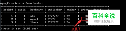 也可以对同一表多个字段进行修改: 例如2:将bookid=3的记录,书名改为redhat linux,作者改为 高*,价格改为40.00. sql语句:update books set bookname='redhat linux' ,author='高*' ,price=40.00 where bookid=3;