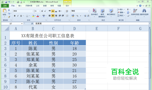 打开一个有姓名列表的电子表格,如下图,假如我想让表格姓名所在列中凡是姓"陈”的姓名文本颜色变成红色,那如何办?