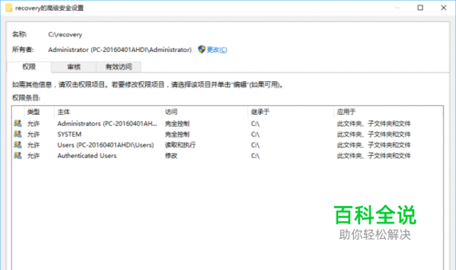 首先右击“C\recovery”目录选择属性,接着在打开的窗口切换到“高级”,将该目录的所有者更改为当前登录管理员用户,这样才可以进行权限的更改(图2)。