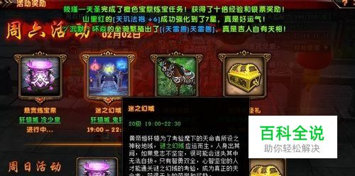 活动玩法: 谜之幻域一共20层,每层都有火、风、水3条通道,玩家可以任意选择一个通道,争取往上层爬,到了20层即走出了迷之幻域。一般是以5层为一个阶段,到了5层、10层、15层会分别获得金果的奖励,使用后能获得相当多的经验奖励。