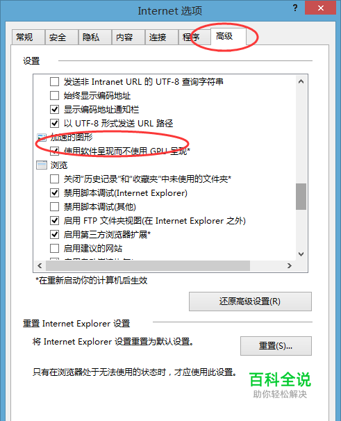 在打开的internet选项卡中,找到“加速的图形”选项,勾选下面的“使用软件呈现而不使用GPU呈现”项,确定保存后,重启下浏览器即可。