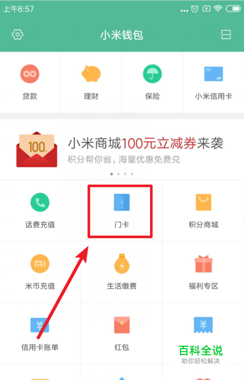 打开小米钱包后,在下方的功能图标内,我们点击门卡的选项进入。