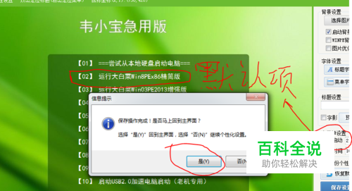 在个性化设置里面把“主菜单设置”下面的“默认启动”改成“2”(原来是1的,是选择本地启动,因为键盘不能用了,所以要改成winpe进行安装,我这里设置默认2,用的软件不一样可能有些区别,大家凭自己的软件设置); 时间可以改段点10s(默认15s)