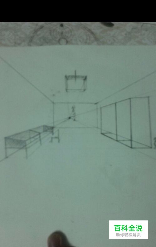 9.上面跟下面是一样的透视在同一条边上了然后把里面的辅助线擦掉,上面打箭头那边线是跟现下面的平形的,上面的灯也是利用这样的透画出来的如图