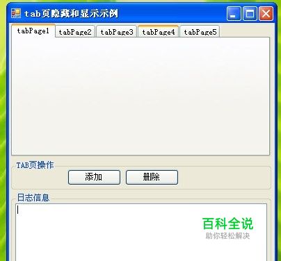 在新程序界面空白窗口上放置合适的控件:包括, 显示操作流程的textbox控件; 测试用的tabcontrol控件,含5个原始页; 用于设置tab页的【添加】和【删除】按钮。