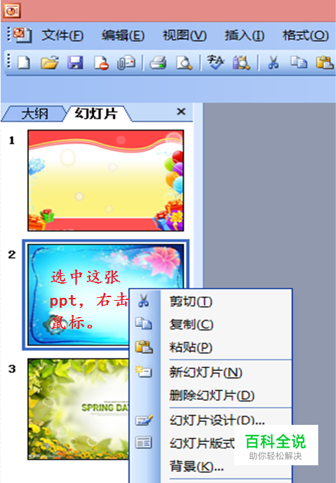 制作好的ppt,如果在播放的时候,有几张幻灯片不让显示出来,怎样把它隐藏起来呢?又怎样取消隐藏呢?选中要隐藏或者取消隐藏的幻灯片,右击鼠标,选择隐藏幻灯片即可。以2003ppt为例说明。