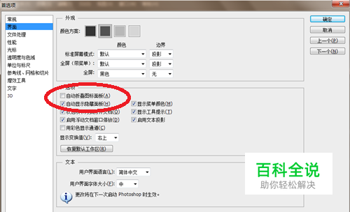 在此对话框中,选择界面(左上方),按下图去掉红圈中的勾