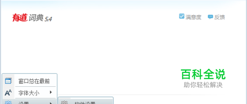 打开有道词典5.4,如下图,依次打开左下角的“主菜单”>设置>软件设置