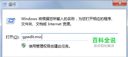 点击“开始”选择“运行”,键入“gpedit.msc”,并运行,打开“组策略”窗口;