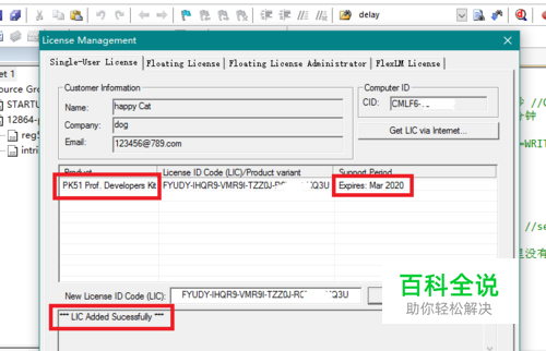 首先确认破解软件红框内选项选择无误(这里以C51为例);证书管理界面(License Management)显示证书已成功安装;然后是破解成功后Keil显示如图所示的警告信息。