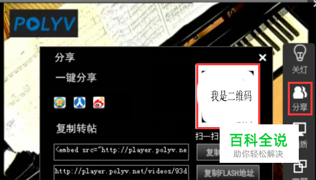 这时打开视频播放,就可以在视频的右侧按钮中“分享”里看到二维码的出现,如下图: