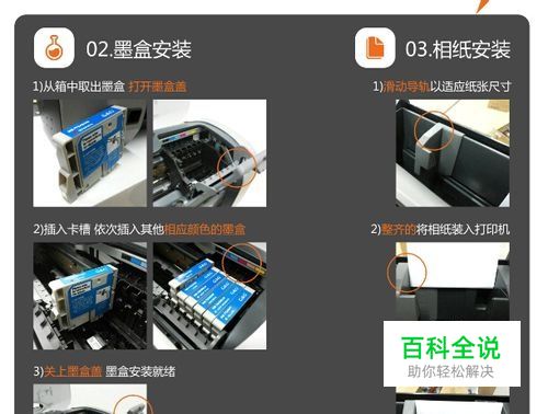 墨盒、相纸安装1)从箱上取出墨盒打开墨盒盖;2)插入卡槽依次插入其他相应颜色的墨盒;3)关上墨盒盖墨盒安装就绪;4)滑动打印导轨以适应纸张尺寸;5)整齐将相纸装入打印机;6)相纸安装就绪。