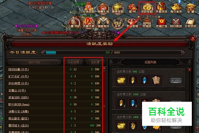 在9377雷霆之怒网页游戏里,为了回馈一些积极参加各种日常活动的玩家,系统准备了各种丰厚的活跃度奖励,玩家只要积累到一定的活跃度,就能将这些活跃度奖励领走。那雷霆之怒活跃度怎么收集呢?我们一起来看看雷霆之怒活跃度的收集方法。 玩家需要通过主线任务,达到一定等级才能激活“活跃奖励”的玩法。当玩家开启该玩法后,在界面上方会有“活跃奖励”图标,通过该图标可进入领取达到要求的活跃度奖励。目前,活跃度奖励共有4份,每位玩家每天只能领取一轮,每天24时自动清零活跃度,并重置活跃度奖励领取次数。玩家每天的活跃度只需达到500点、1000点、1800点、3000点,都各自能领取1份丰厚奖励,奖励主要有绑定元宝、宝石结晶、书页、幻神灵力丹。大家积累的活跃度越高,领取到的奖励越丰厚。 玩家需要收集活跃度,主要按照活跃度界面里的相关项目要求,完成相应的项目进度,就能获得相应的活跃度。各个活跃项目的完成进度要求及其所得活跃度如下: 降妖伏魔(任务)——完成12次(可获得300点活跃度); 矿区采矿(任务)——完成3次(可获得300点活跃度); 护送押镖(任务)——完成2次(可获得100点活跃度); 封魔谷(任务)——完成2次(可获得500点活跃度); 装备回收(回收)——完成50次(可获得500点活跃度); 野外BOSS(boss)——完成10次(可获得500点活跃度); 消费元宝(消费)——完成1次(可获得200点活跃度); 消费绑定元宝(消费)——完成1次(可获得200点活跃度); 帮会副本(副本)——完成1次(可获得500点活跃度); 膜拜城主(活动)——完成2次(可获得200点活跃度); 恶魔神殿(活动)——完成3次(可获得300点活跃度); 龙潭争霸(活动)——完成1次(可获得100点活跃度); 夺宝奇兵(活动)——完成1次(可获得100点活跃度); 神魔战场(活动)——完成2次(可获得200点活跃度)。
