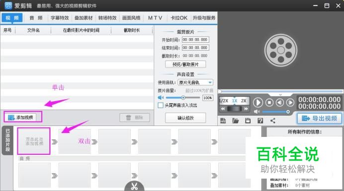 我们单击上方“添加视频”或者双击下方都可以快速的添加视频,如图。