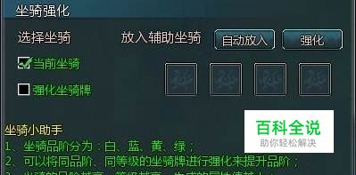 坐骑强化 坐骑强化需要用到坐骑牌。收集4个相同等级相同品阶的坐骑牌后,左键点击坐骑牌选择坐骑强化,可在宠物界面进行坐骑合成。合成后的坐骑将会获得更高的品阶并提高坐骑属性。75级的汗血马在强化至绿色品级的赤兔马后,还能额外生成武力、智谋、统帅、兵法、体质属性。75级以上玩家将开通马匹部件功能。马匹部件功能在马匹界面点击“开启部件”进行开通。马匹部件主要有增加马匹攻击的马蹄铁和增加马匹生命值的马盔甲。使用精铁可以升级马匹部件,强化马匹属性。