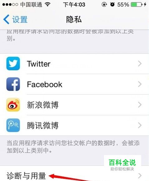 点击诊断与用量,选择关闭。这个功能会自动记忆您的位置和崩溃诊断及用量数据给iPhone