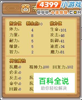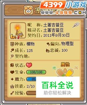 ③ 来看看土著吉普豆的初始加点吧! 看来土著吉普豆主要是力量突出呢!其他属性都比较平均呢。既然如此,加点建议全力,相信全力的话,成长起来的土著吉普豆可以拥有不俗的攻击力的!或者可以考虑除了力量之外,再加点速度,让它出手可以快一些,毕竟在战斗中,出手速度快的话,也会多一分胜算的。