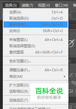 常用的选择操作快捷键: 全部选取[Ctrl+A] 取消选择[Ctrl+D] 重新选择[Ctrl+Shift+D] 调整边缘[Ctrl+Shift+R] 反向[Ctrl+Shift+I]