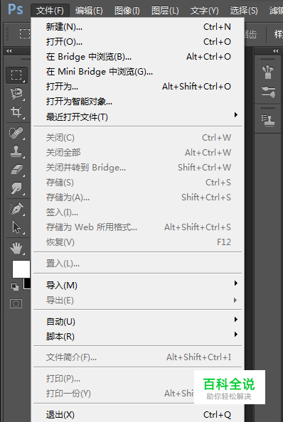 常用的文件操作快捷键: 新建图形文件[Ctrl+N] 打开已有的图像[Ctrl+O] 保存当前图像[Ctrl+S] 关闭当前图像[Ctrl+W] 另存为[Ctrl+Shift+S] 储存为web和设备所用格式[Ctrl+Alt+Shift+S] 打印[Ctrl+P] 退出[Ctrl+Q]