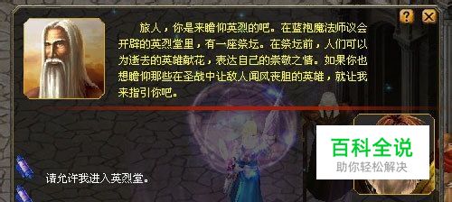 为了进入英烈堂瞻仰先烈遗风,你找到大魔法师蓝尼。在他的指点下,你开始筹集三件瞻仰仪式所必需的圣物:圣堂战剑、魂珀球和花束。