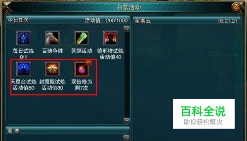 天星台试炼:从日常面板中进入天星台,与普济宗智者对话开始挑战。(小诀窍:击杀的“盗宝者”数量越多,获得的成绩就越好,奖励的宝箱也越好。)