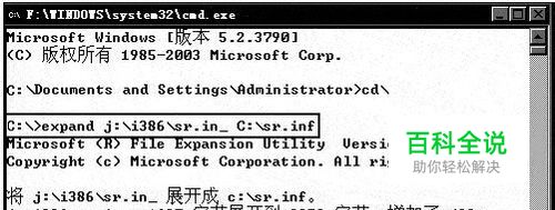 第1步 进入到Windows 2003操作系统中,将Windows XP安装光盘插入光驱的同时按住Shift键取消其自动运行。单击 “开始→运行”命令,在运行对话框中输入“cmd”后回车,打开命令提示符窗口。在命令提示符后面输入“expand X:i386sr.in_ C:sr.inf”后回车,将Windows XP安装光盘i386目录下的sr.in_提取到C盘根目录下,如图1所 示。其中,X指光驱的盘符,用户请根据自己的实际情况做适当修改。