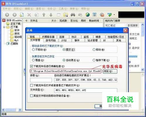 如何将病毒、木马拒之门外,还我们一个轻松上网的环境,显得特别重要了。只要你安装了光华反病毒软件,再通过网际快车下载文件,系统就会自动调用杀毒功能,保证下载到本地的所有文件的安全。 安装光华反病毒软件后,系统会自动嵌入网际快车,在网际快车主界面上,选择“工具”菜单下的“选项”,在弹出的“选项”对话框中切换到“文件管理”选项卡,我们可以看到光华反病毒软件已经自动设置好:C:\Program Files\GreatSoft\VirusClean\vcn.exe /pt FlashGet(如图1)。网际快车和光华反病毒软件相互嵌入,自动识别,不需要用户再做任何设置。
