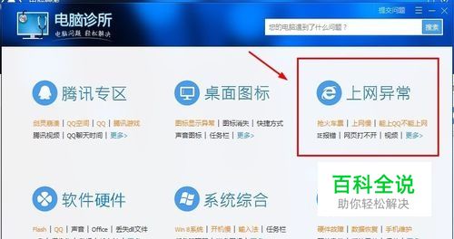 上网异常也包括各种上网问题,如“上不了网”、“上网慢”等问题。现在我们选择第一个上网问题,即“上不了网”作为例子,如图。