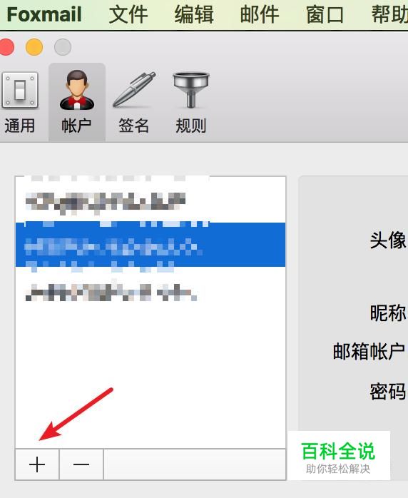 打开foxmail账号设置页面,点击下方的+号图标来添加账号。