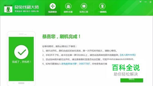 手机根据弹窗提示进入挖煤模式后, 请重新插拔一下数据线以重新连接,重新连接后软件会自动开始线刷。奇兔线刷大师刷机成功之后,等待开机即可。