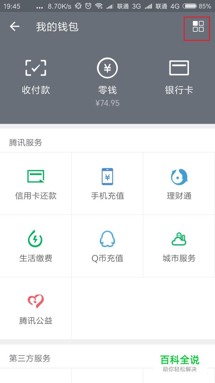 首先,我们打开微信钱包页面,在微信钱包页面中,点击右上角方框图标进入设置页面。