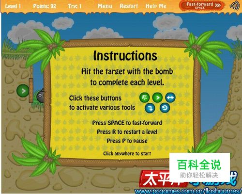 游戏中使用鼠标操作,点击绿色按钮将炸弹弹起,使炸弹击中靶心后过关。