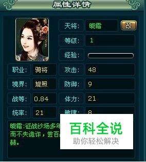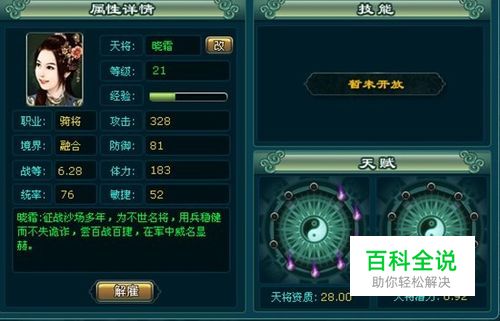 上图是一个表面看起来资质很平凡的绿将。那么这个将领应不应该培养呢?那么第二我们应该考虑的就是天将的属性了。据colin一直以来的招募天将的经验,结合游戏心得,我发现:步将看,防御和体力,满防为30,满体为32(1级白将或绿将,以下相同);骑将看攻击和体力,满攻为50,满体为29;弓将看攻击和敏捷,满攻为25,满敏为42;法将看攻击和敏捷,满攻为45,满敏为20;飞将看攻击和敏捷,满攻为28,满敏为32.这样看来,上图的骑将攻击差2接近满攻,还不错;体力21比较低,4个属性加起来86,根据我看过的最低4属性和75,最高4属性值98来说,86可谓是中间水平,但是,这样的水平中,这个天将的战等居然有0.84(我看过最高的1.08,最低的0.52),稍微排得比较靠前,根据天将的资质影响天将的基本属性,所以可以估计,这个绿将资质应该不低。我升到21级,一看:资质28,潜力0.92,对于非RMB或小RMB玩家来说,也算可以了。第四要看天将的统率,21统率为佳。