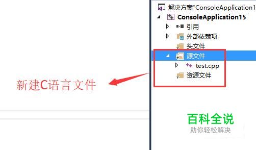 首先在Visual Studio 中新建C语言项目,并且在源文件下面新建C语言文件,如下图所示