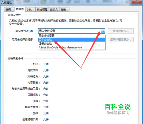 3、点击“安全性方法”后会弹出一个下拉对话框,我们点击“口令安全性”, 注:打开限制文档口令就是你需要密码才能浏览文件内容,这种加密型的文件一般很难破解;限制文档编辑和打印是指文档可以打开也可以查看,但无法编辑、转换等。