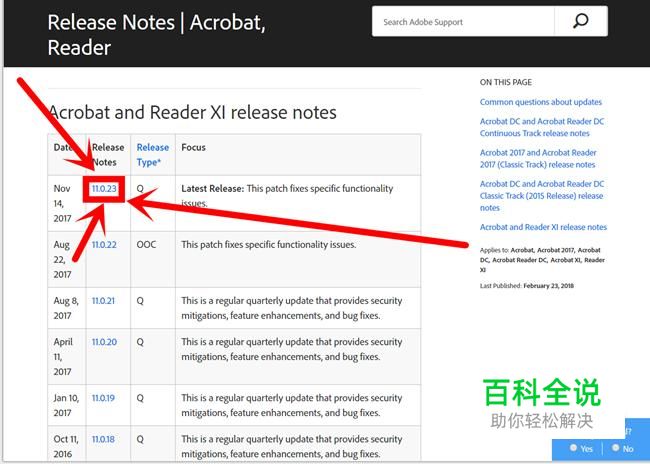 点击“ Acrobat and Reader XI release notes ”列表里最上面的版本号。 本例中最上面的版本号为“ 11.0.23 ”,仅供参考。