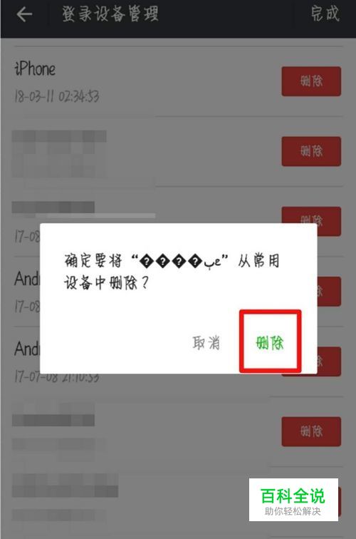 最后在小窗口点击【删除】再次确认删除的请求,删除了之后,以后该设备若想登录这个账号,就需要验证手机号了。