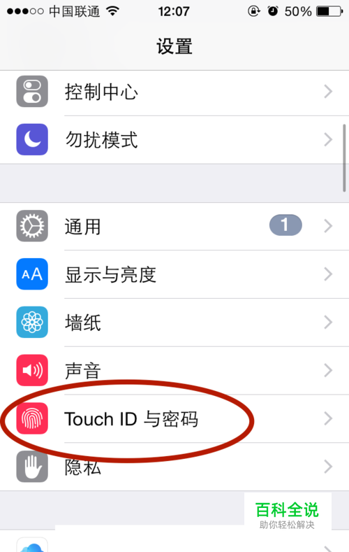 往下拉,找到touch id与密码。首先输入4位密码进入。 这里要提醒大家:如果你的手机之前没有设置过密码,要先设置一个四位数的密码。这里如果不设置密码,是无法进行指纹设置的。