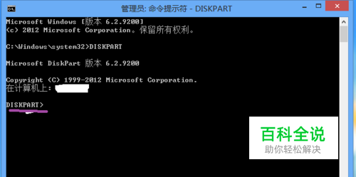 在弹出的DOS窗口输入“DISKPART”命令-》回车,进入磁盘操作
