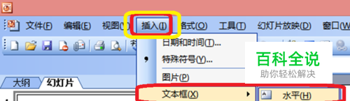 打开一个ppt,找到插入文本框的工具。具体做法:点击上方工具栏中的插入,在下拉框里选择“文本框——水平”。